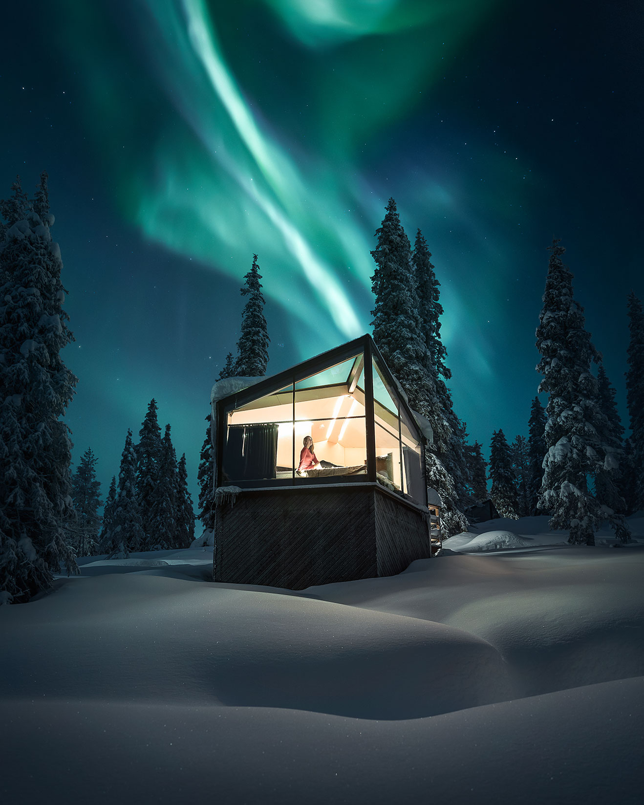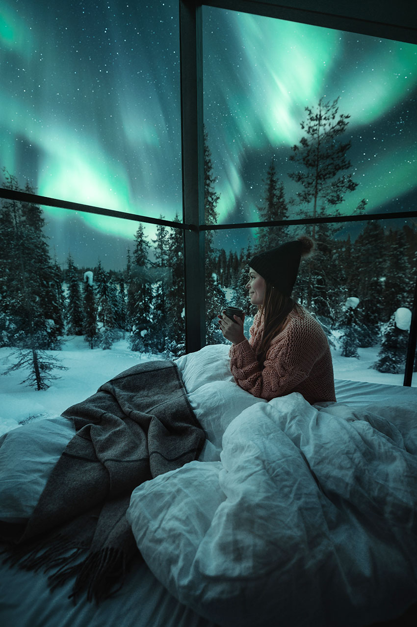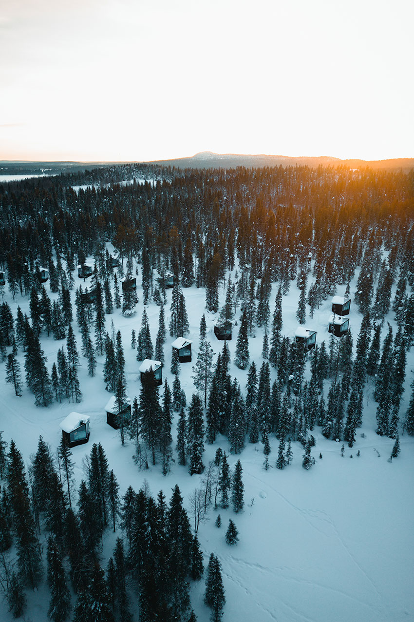 Het vooraanstaande Finse architectenbureau Kanttia2 heeft de suites zo ontworpen dat ze opgaan in de taigawouden. Iedere vierkante meter is zorgvuldig gepland, zodat je op de meest comfortabele manier van de schoonheid van de natuur kunt genieten. Zo beschikt jouw suite over een groot venster van glas en is het dak deels van glas zodat jij optimaal kunt genieten van het uitzicht over de directe omgeving, op de sterrenhemel en het Noorderlicht mocht deze de hemel kleuren.