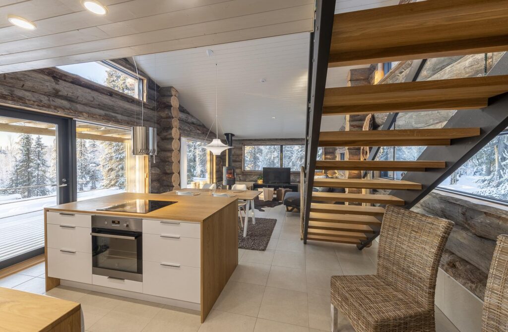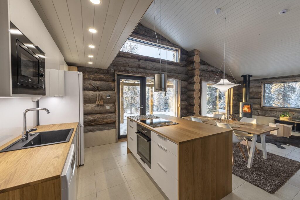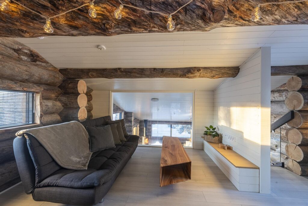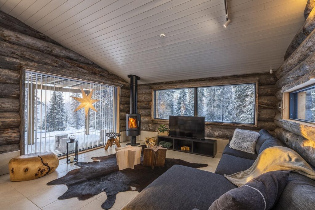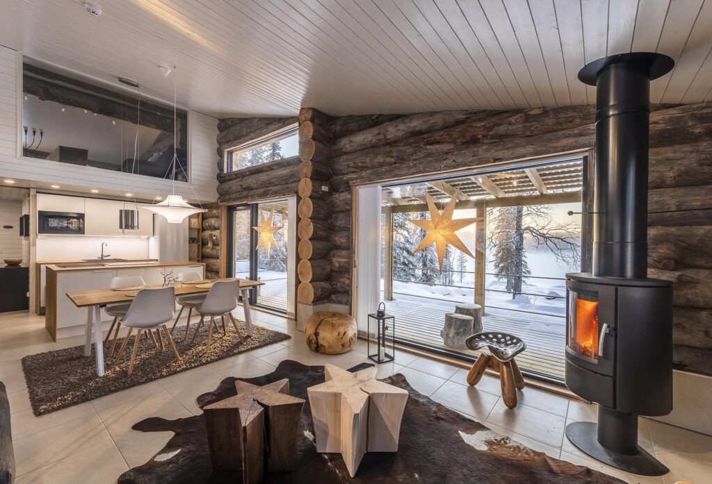 Deze karakteristieke houten vakantiewoning, gebouwd met zeldzame Kelo-boomstammen, ademt de sfeer van het ruige, pure Lapland. Het hout vertelt een verhaal, over eeuwenoude bomen, over winters die je voelt in je botten, en over warmte – de warmte van een knisperend haardvuur na een dag buiten. De woning (100m²) is ontworpen met oog voor comfort, sfeer en rust. Scandinavisch ingericht, met een persoonlijke en warme toets.