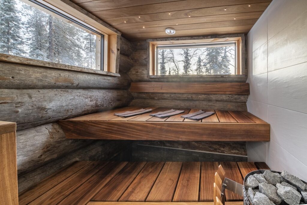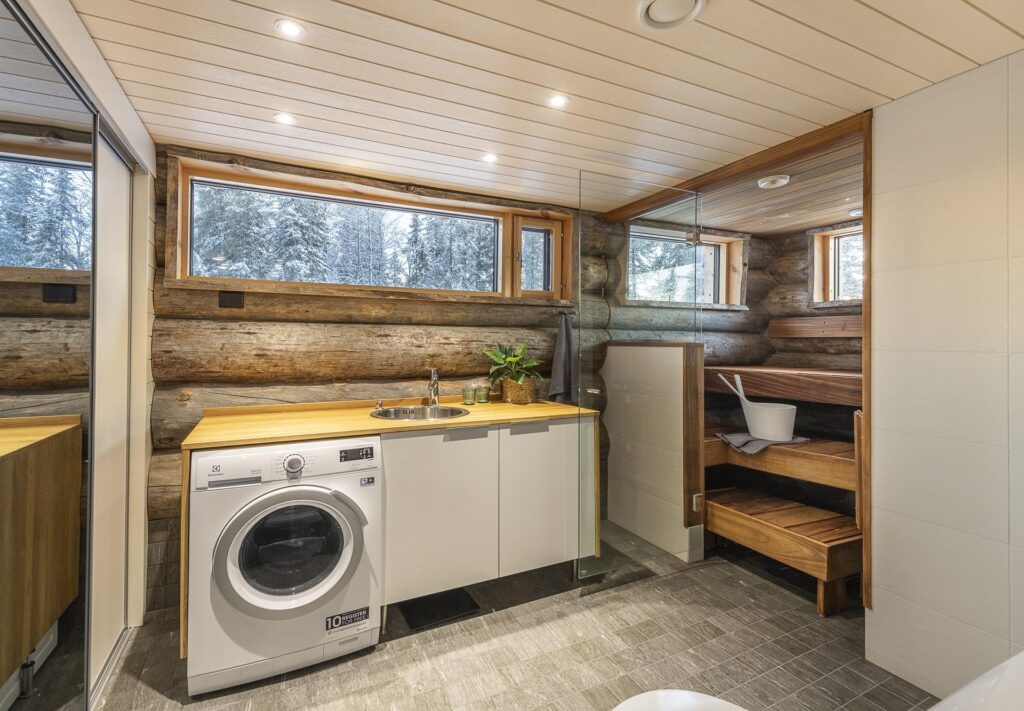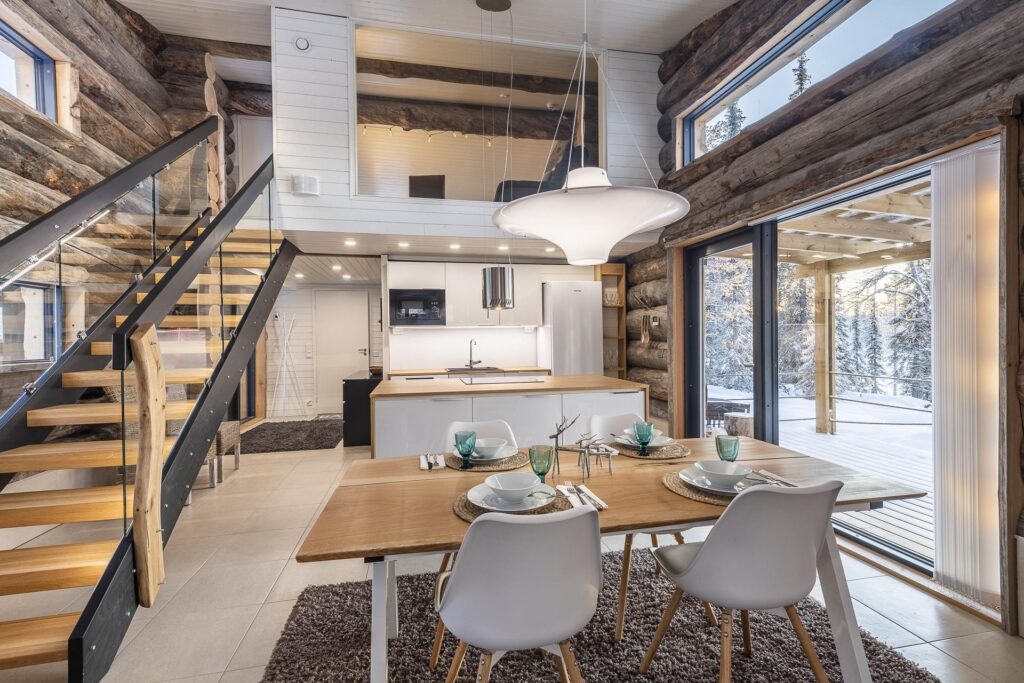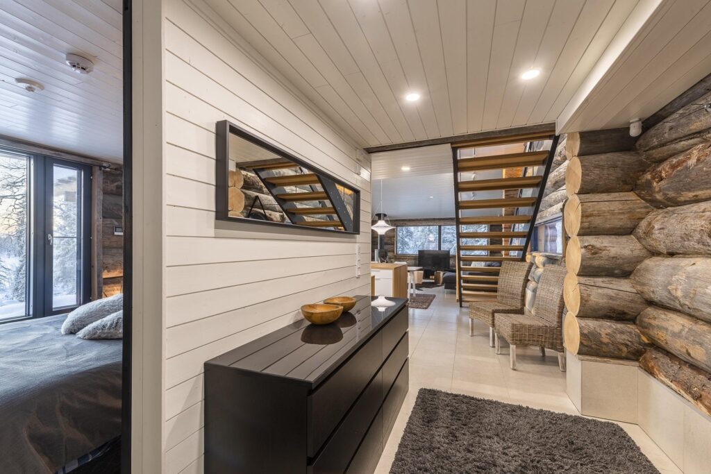Deze karakteristieke houten vakantiewoning, gebouwd met zeldzame Kelo-boomstammen, ademt de sfeer van het ruige, pure Lapland. Het hout vertelt een verhaal, over eeuwenoude bomen, over winters die je voelt in je botten, en over warmte – de warmte van een knisperend haardvuur na een dag buiten. De woning (100m²) is ontworpen met oog voor comfort, sfeer en rust. Scandinavisch ingericht, met een persoonlijke en warme toets.