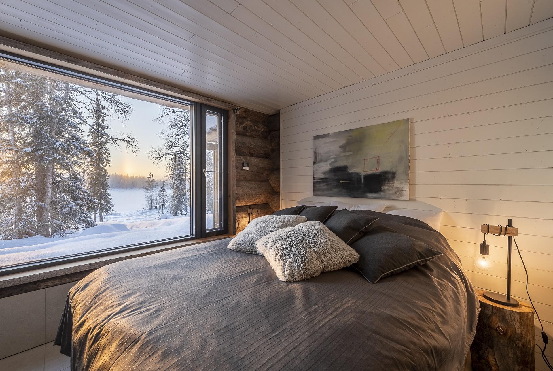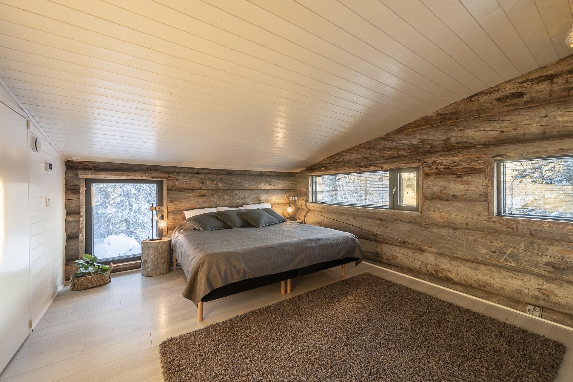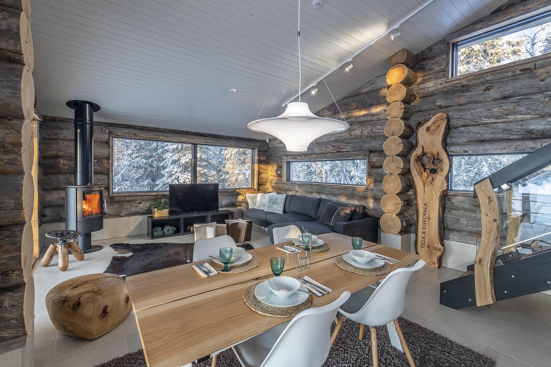 Deze karakteristieke houten vakantiewoning, gebouwd met zeldzame Kelo-boomstammen, ademt de sfeer van het ruige, pure Lapland. Het hout vertelt een verhaal, over eeuwenoude bomen, over winters die je voelt in je botten, en over warmte – de warmte van een knisperend haardvuur na een dag buiten. De woning (100m²) is ontworpen met oog voor comfort, sfeer en rust. Scandinavisch ingericht, met een persoonlijke en warme toets.