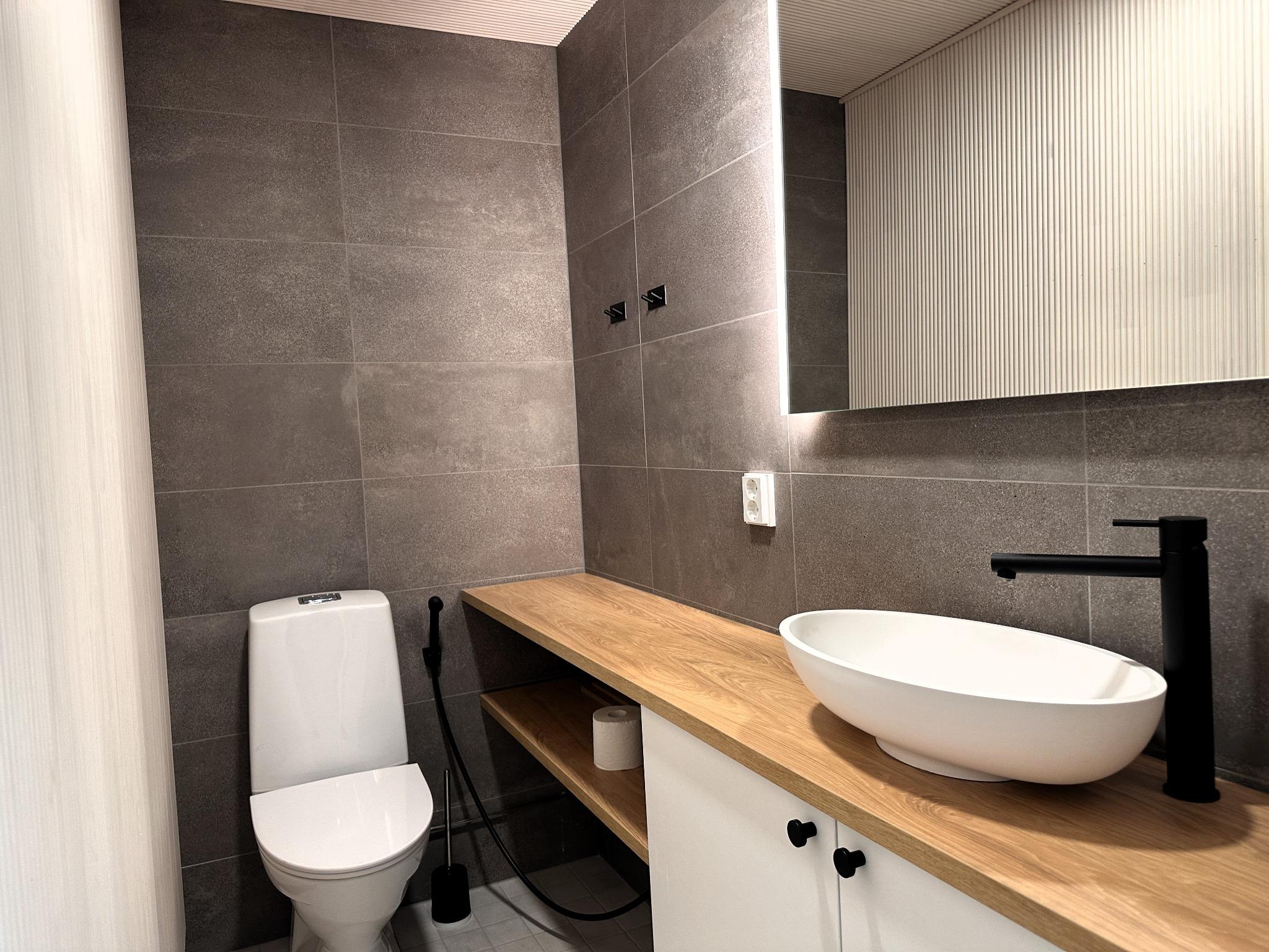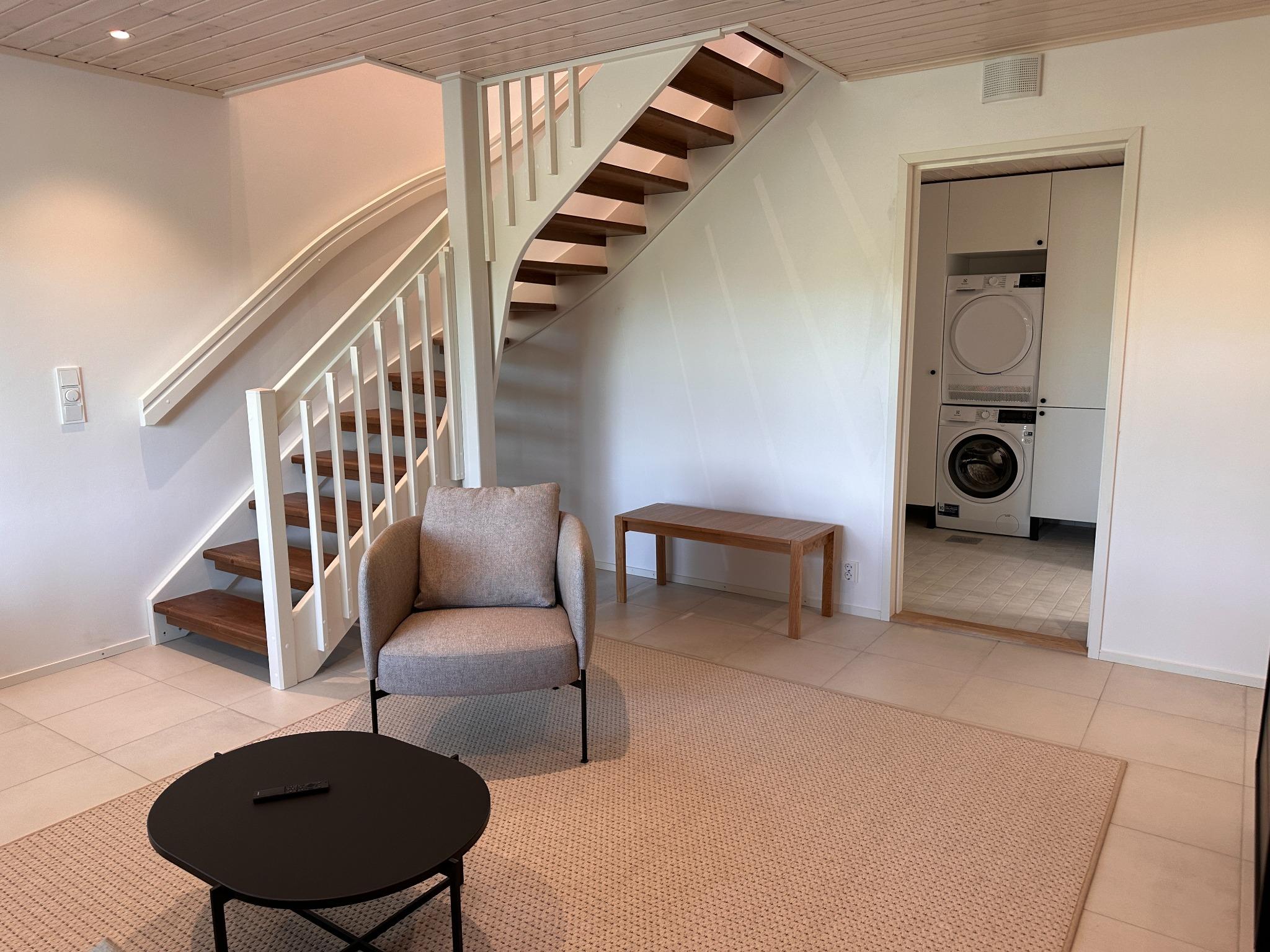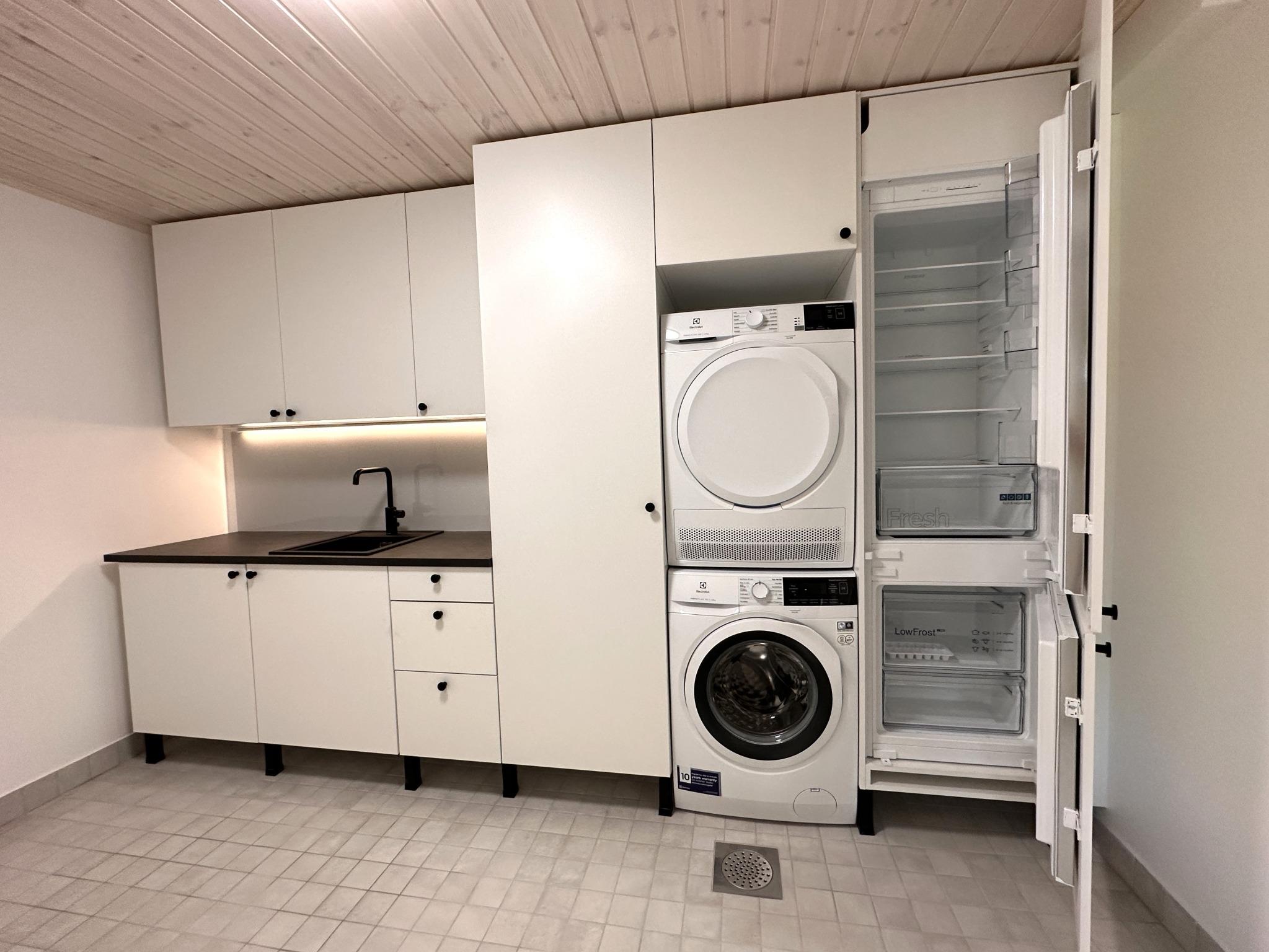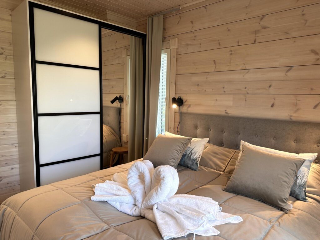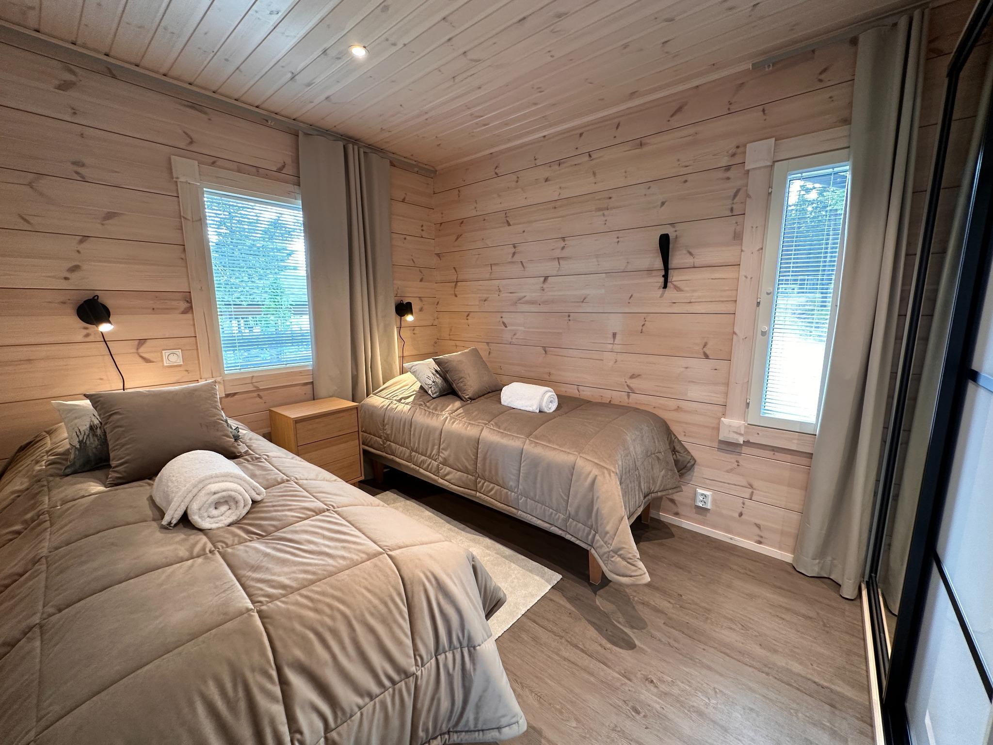 Wanneer je de lichte, open keuken en woonkamer binnenstapt, lijkt het alsof de natuur zelf je welkom heet. Het uitzicht over het stille meertje strekt zich voor je uit, als een levend schilderij dat elk seizoen van kleur verandert. Geniet van de intense zonnestralen, terwijl je op het glazen terras zit, met een dampende kop koffie in je hand. Soms verschijnen er ineens rendieren, die in alle rust langs het huis wandelen, alsof ze deel uitmaken van je ochtendritueel. In de winter wordt het decor magisch: de bomen dragen een zachte mantel van sneeuw en de enige geluiden die je hoort, zijn die van je eigen ademhaling en de stilte.