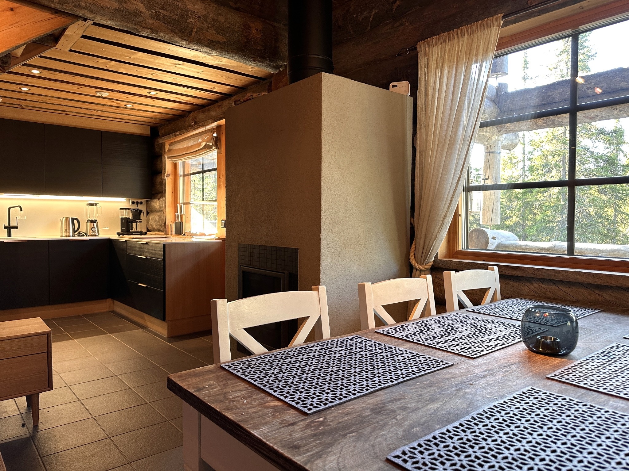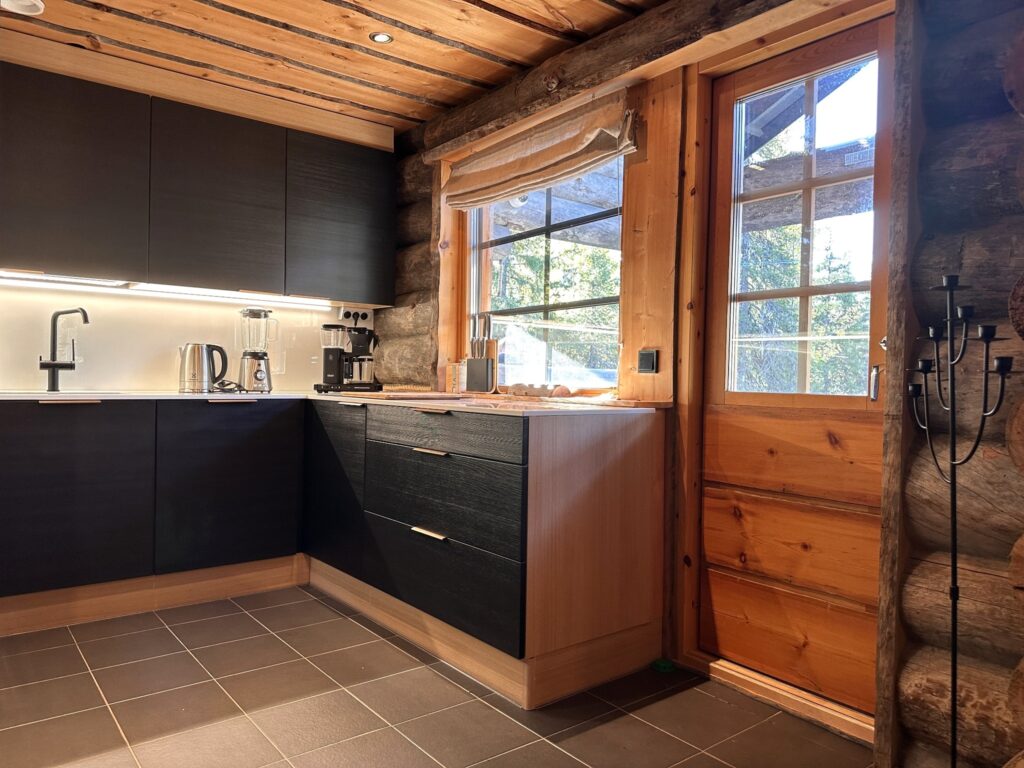 De open woonkamer en keuken vormen het hart van jouw Loghouse. Grote ramen brengen het omliggende bos naar binnen en geven het huis een lichte, rustige sfeer. In de ruime en goed uitgeruste keuken bereid je eenvoudig een ontbijt of een uitgebreid diner na een heerlijke dag in de buitenlucht.