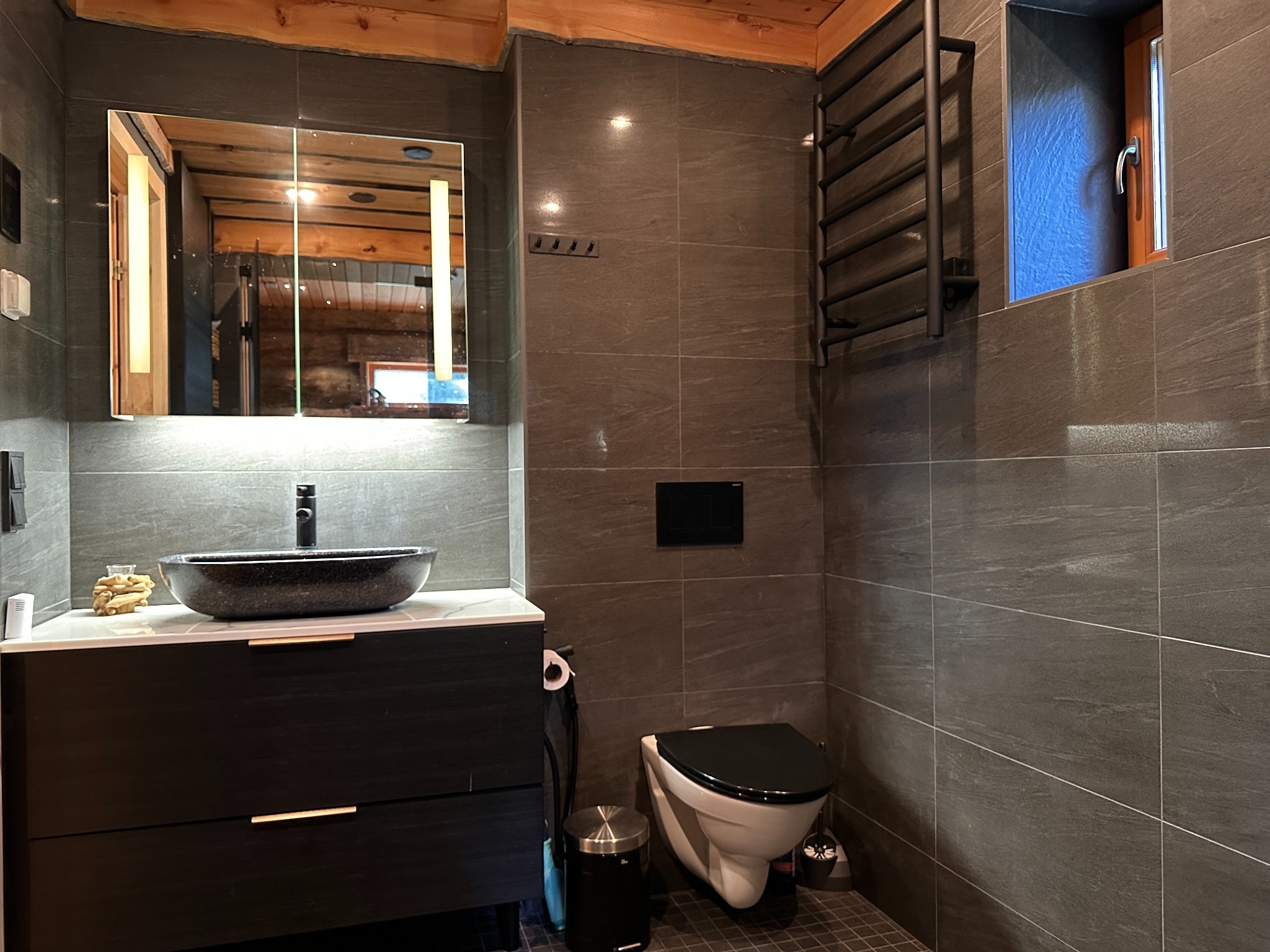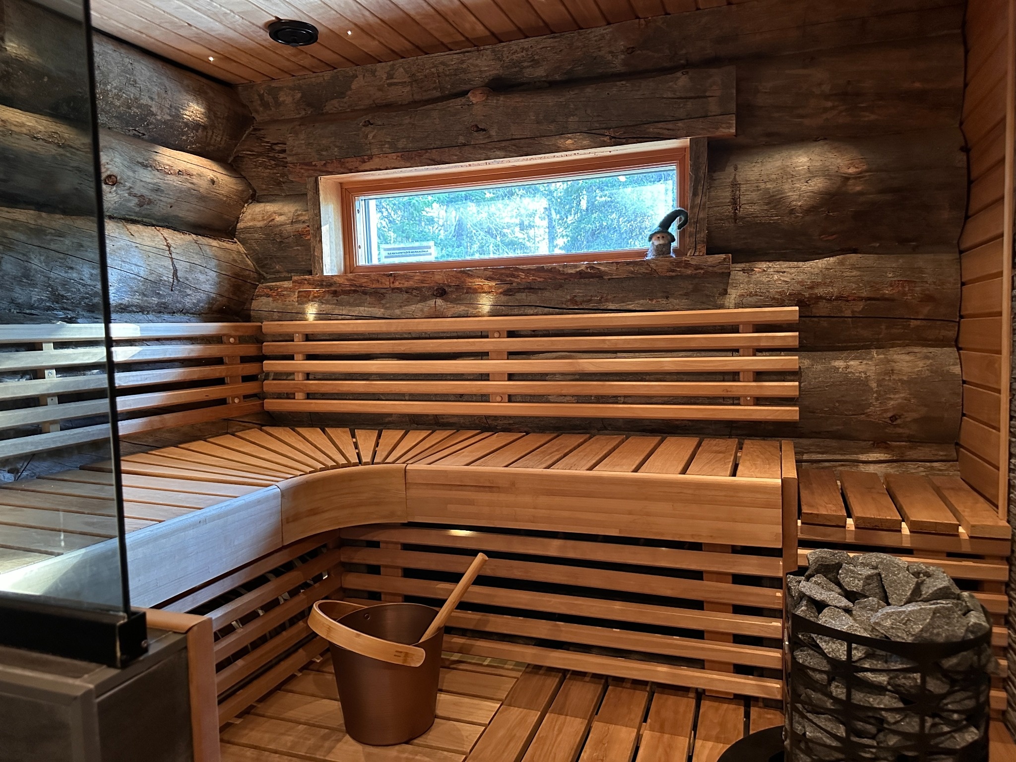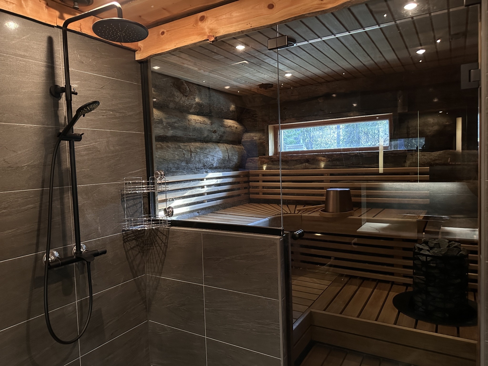 De sauna is heerlijk warm en stoomrijk, en terwijl je ontspant kun je uitkijken over het prachtige boslandschap. In het saunagedeelte van de cottage bevinden zich een regendouche en een toilet.